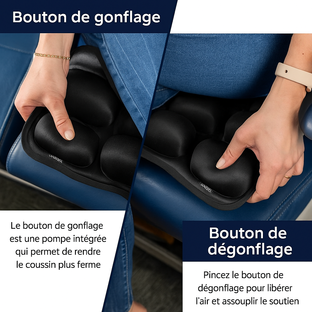 Grâce à son bouton de gonflage intégré, ajustez facilement la fermeté de votre coussin pour un maintien optimal.
