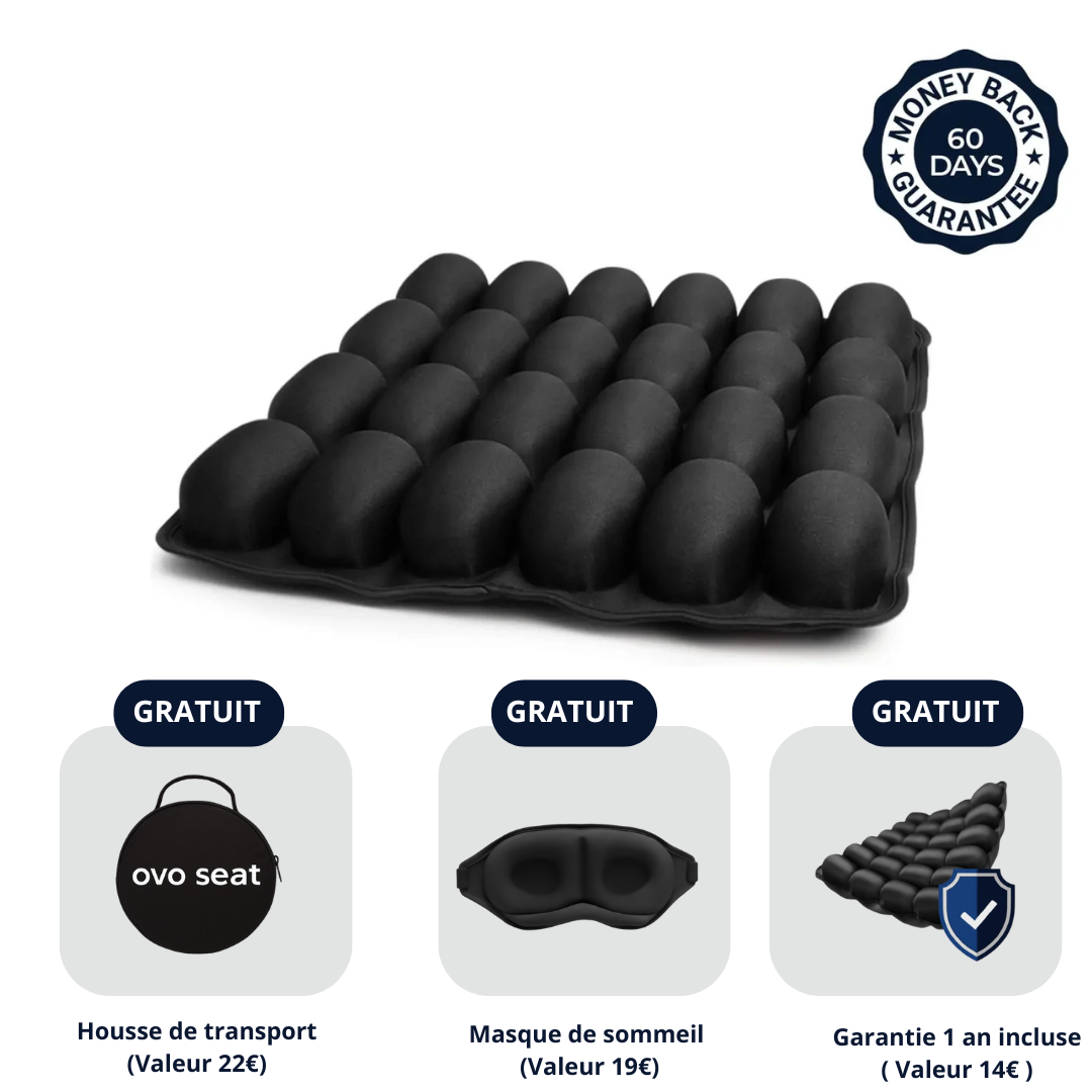 Le coussin de voyage OVO est équipé de 24 cellules d’air interconnectées qui répartissent la pression pour un confort optimal du dos, des fessiers et du coccyx.